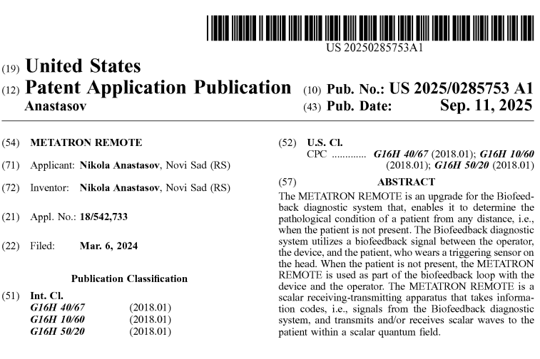 The startup MetaTest.me is based on a patent that has just been registered. Metatron Remote® is a patent-protected (U.S. Pat. No. 20250285753 dated Sep. 11, 2025) and trademarked quantum system that enables remote health scanning and therapy at any distance using only client information. This is the first and only remote health system that does not require biological material. The patented system is materialized, functional and in use.